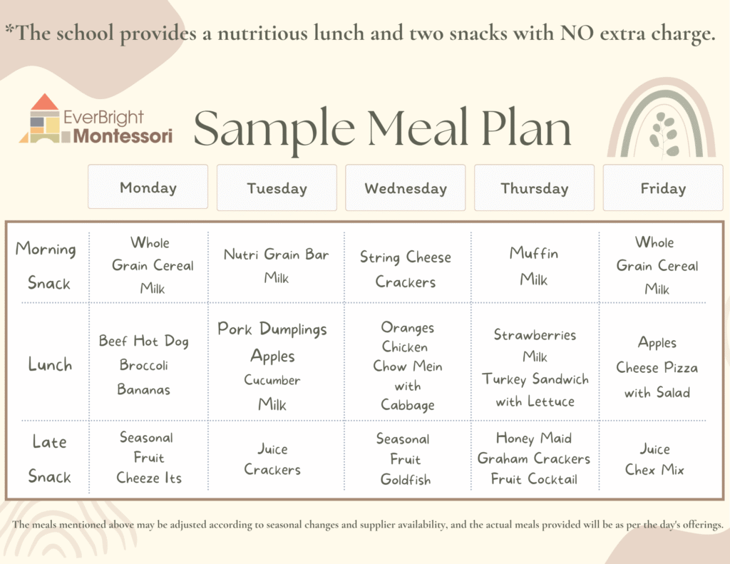 We believe that every child deserves nutritious and satisfying meals. To ensure this, we have developed a comprehensive lunch and snacks program that guarantees all children receive a well-balanced meal each day, without any additional charges. Our offerings include: